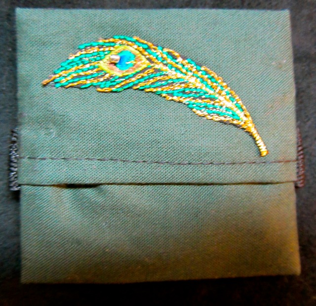 This hunter green bag accented with a large peacock feather and silver bead measures about 3" x 3", with velcro tabs on the back to fasten to your harness, collar or leash, and includes one emergency poo bag for those unexpected moments.