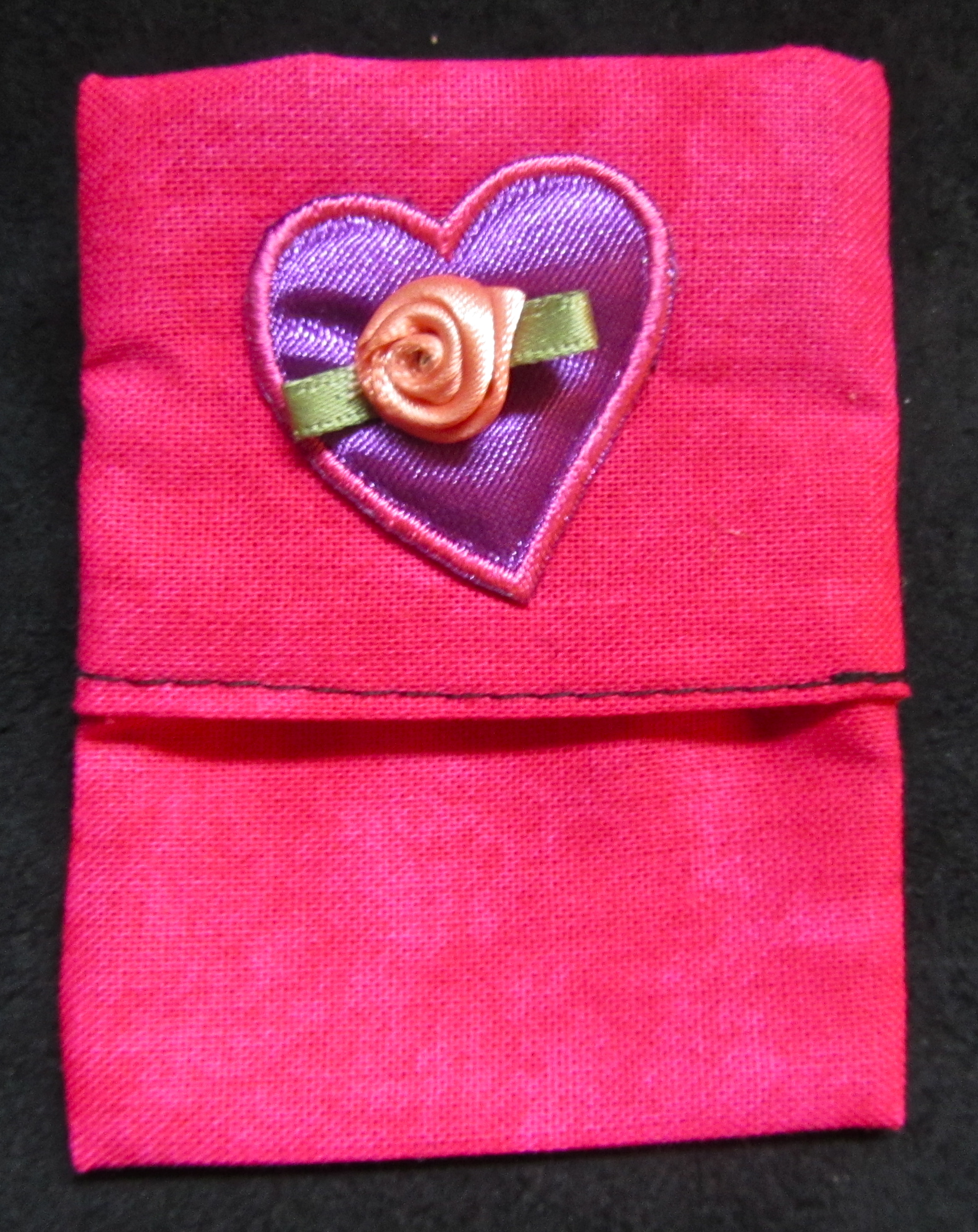 Jazzy and sweet, this summer bright raspberry haze bag is accented with a purple satin heart topped with an orange ribbon rose and silver bead. It measures about 2" x 3", with velcro tabs on the back to fasten to your harness, collar or leash, and includes one emergency poo bag for those ...unexpected moments.