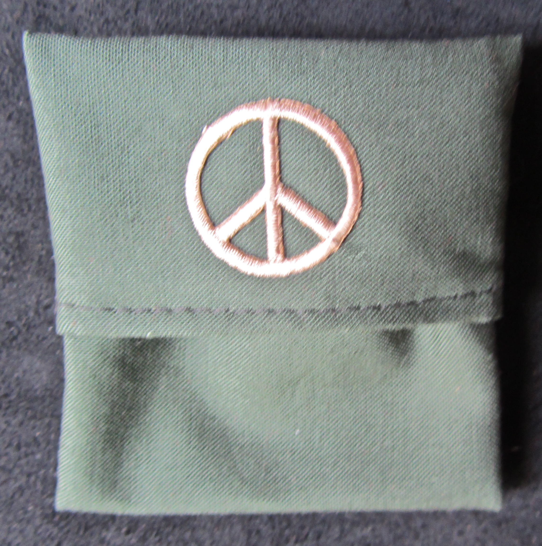 This earthy peace sign bag measures about 3" x 3", with velcro tabs on the back to fasten to your harness, collar or leash, and includes one emergency poo bag for those ...unexpected moments.