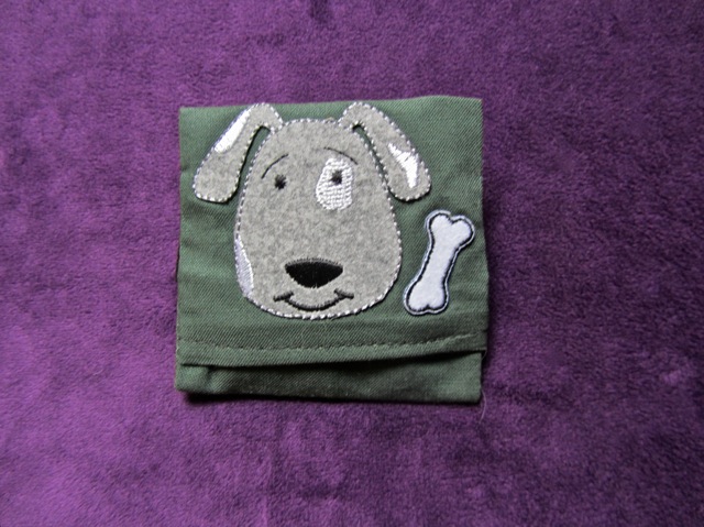 Give that dog a bone! Express your love of bones with this hunter green bag with a gray dog face and coordinated bone. It measures about 3" x 3", with velcro tabs on the back to fasten to your harness, collar or leash, and includes one emergency poo bag for those ...unexpected moments.