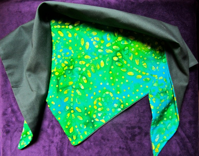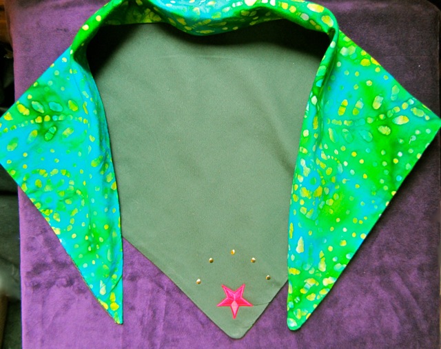 This versatile bandana is two looks in one--on one side, it's solid hunter green with a gold star and five studs at the point on one side, turn it over and it's a beautiful green/yellow/blue tie-dye on the other. It measures approximately 27" around the neck by 13" long at the point. The neck edge can be turned so the reverse color shows and the point is shorter. Get several looks with one bandana!