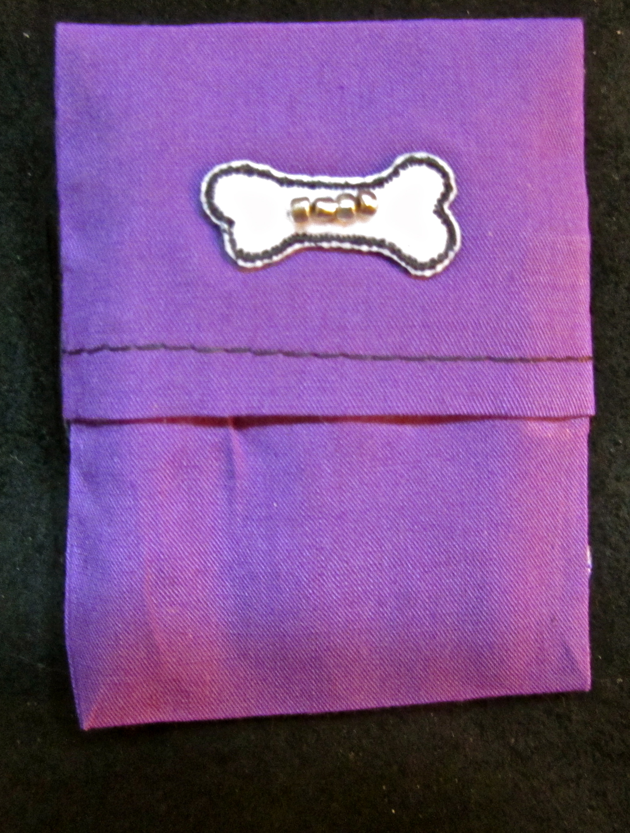 You'll be the envy of the dog park with this little patch of purple accented with a dog bone and silver beads. This bag is about 2" x 3", with velcro tabs on the back to fasten to your harness, collar or leash. It includes one emergency poo bag.