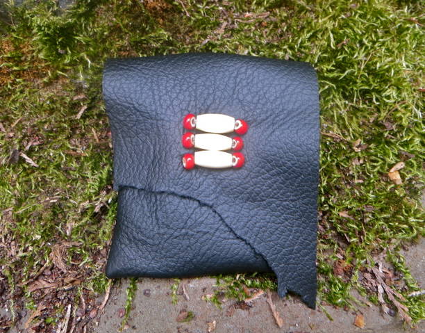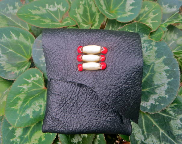 Black Buckskin Dog Pocket with Bone Hairpipes & Red White-Heart Beads