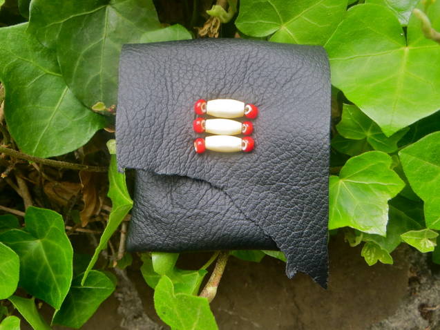 Each leather Dog Pocket is unique, so may vary slightly according to the part of the hide from which it is cut. Each is lovingly made by hand; all beads, buttons, and decorations are reinforced for strength using imitation sinew.