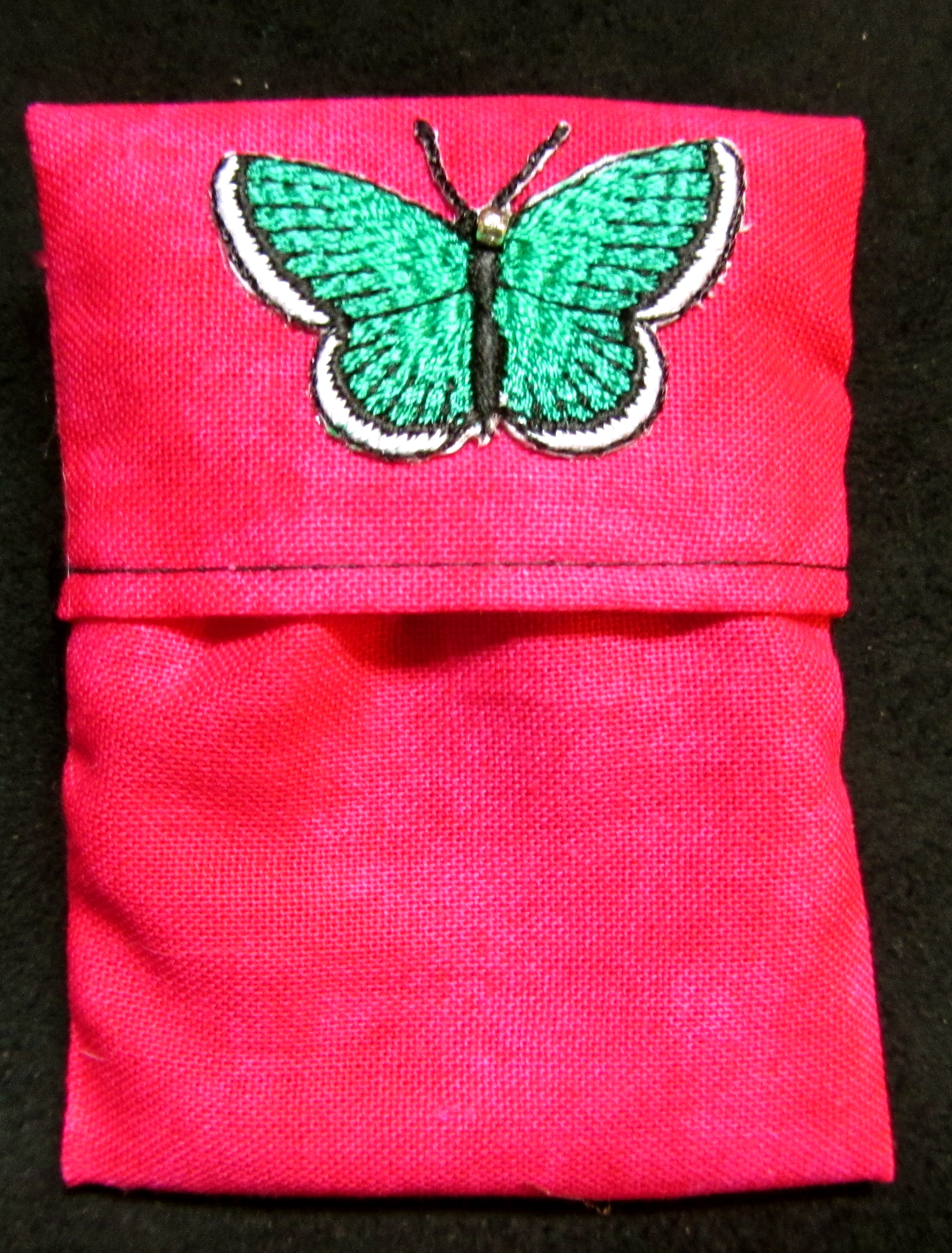 This summery raspberry haze bag is accented with a shimmering green butterfly and silver bead. It measures about 2" x 3", with velcro tabs on the back to fasten to your harness, collar or leash, and includes one emergency poo bag for those ... unexpected moments.