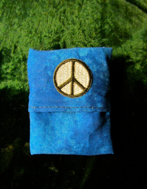 Show your peaceful nature with this elegant blue haze bag accented with a white circle of peace. It measures about 2" x 3", with velcro tabs on the back to fasten to your harness, collar or leash, and includes one emergency poo bag for those ...unexpected moments.